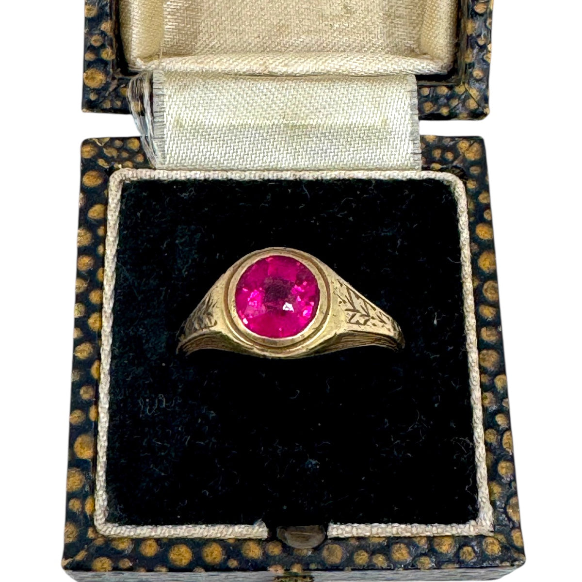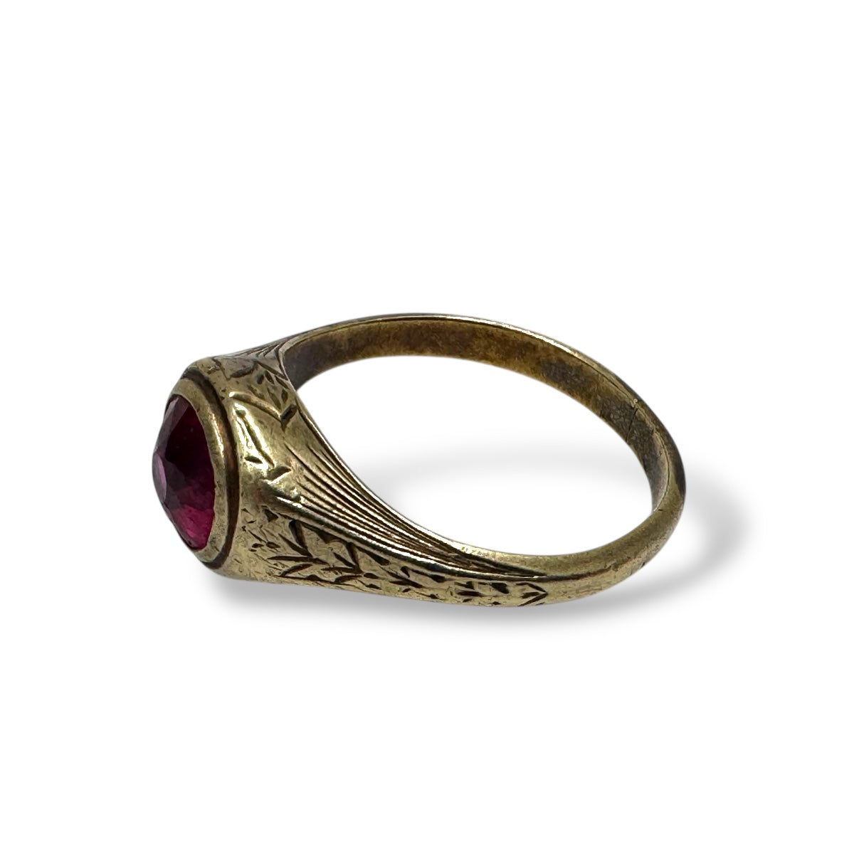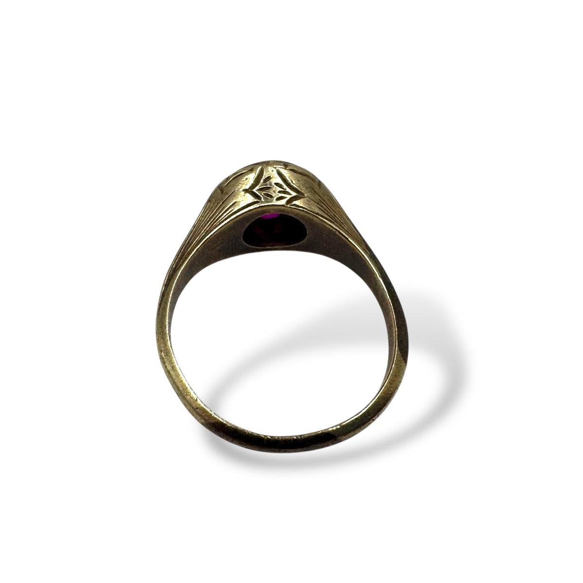 טבעת זהב עתיקה , בעיצוב קלאסי, מעוטרת בחריטות ביד אומן. מברכז הטבעת משובצת אבן חן אדומה  . הטבעת עשויה זהב 9 קארט, במשקל של כ-5 גרם
